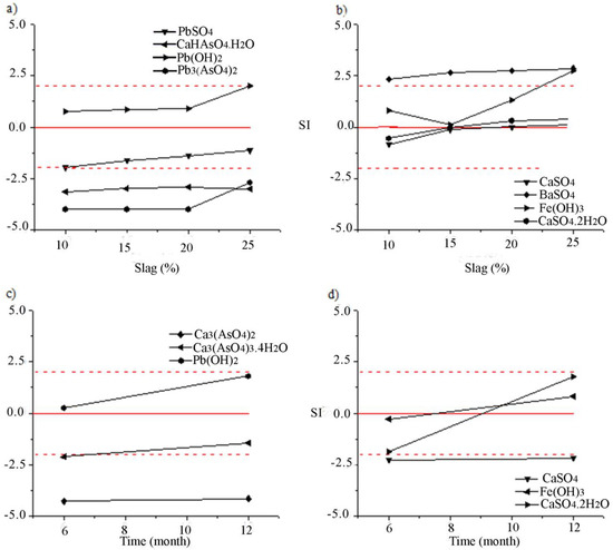 Saturation indices of minerals: (a) PbSO4, CaHAsO4·H2O, Pb(OH)2, Pb3(AsO4)2 and (b) CaSO4, BaSO4, Fe(OH)3, CaSO4·2H2O as a function of slag content into solidified samples (TCLP test); (c) Ca3(AsO4)2, Ca3(AsO4)3·4H2O, Pb(OH)2 and (d) CaSO4, Fe(OH)3, CaSO4·2H2O as a function of time (LEC test).