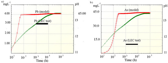 The PHREEQC program [19] was used to simulate the concentrations of Pb and As leached from solidified products and pH values of leachates during the time. The simulation was based on the calculation of the equilibrium between the aqueous solutions and the minerals, solid solutions, exchangers, and sorption surfaces. The program results were the speciation and concentrations of the elements, as well as the degree of saturation of the leachate with respect to mineral phases as a function of leaching time.