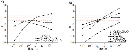 Saturation indices of minerals: (a) Pb and As, and (b) Ca as a function of leaching time (modeling results for S25).
