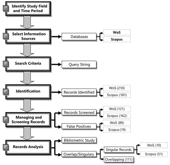 The existence today of a multitude of national and international databases, both generic and specialized, makes it necessary to evaluate which of them makes a greater coverage of the area to be studied, since the choice adequacy will largely depend on the validity of the results obtained [54]. In this research, the Web of Science (WoS) and Scopus databases were chosen, which are both worldwide references that have been subject to comparisons from the perspective of their coverage: collected articles, journal titles, thematic and geographical areas, affiliation, languages, citation analysis [55,56].