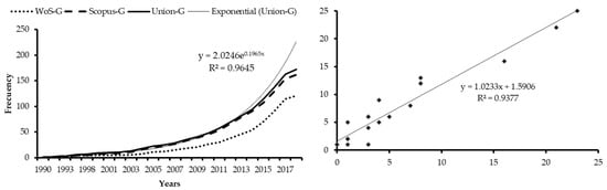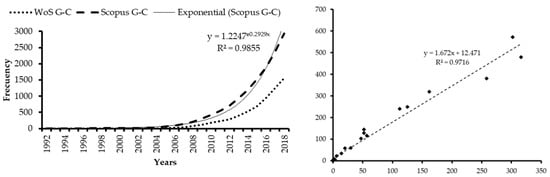 On the other hand, there is a constant growth in the number of citations that the articles receive annually (Figure 3), which has constantly been occurring since 2007, reaching the maximum number of 302 citations in WoS and 572 citations in Scopus in 2018. There is also a strong correlation between the number of citations received per year between both bases, with R2 = 0.9716. A more detailed citation analysis shows that only 2.48% (three) of WoS articles and 3.86% (five) of Scopus articles receive more than 100 citations, 4.96% (six) and 5.56% (nine) respectively, between 50 and 100 citations, 27.27% (33) and 30.25% (49) between 10 and 49 and 47.93% (58) and 49.38% (80) between one and nine. Only 17.36% (21) of WoS articles and 11.73% (19) of Scopus articles do not receive any citations. Note what was stated by Merigó et al. [59], articles published within the last 10 years may not have reached their maximum citation level yet.