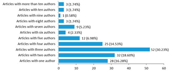 The highest percentage of articles, 30.23% (52) are signed by three authors, followed by 18.60% (32), which are signed by two authors and 16.28% (28) by one author (Figure 4). The existence of articles with more than 10 authorships can distort the previously seen collaboration index in a certain way. This is the case, for example, of The Lower Saxony research network design of environments for aging: towards interdisciplinary research on information and communication technologies in aging societies [74], with 75 signatures or information and communication technologies for promoting and sustaining quality of life, health and self-sufficiency in aging societies-outcomes of the Lower Saxony Research Network Design of Environments for Aging (GAL) [75] with 61 signatures.