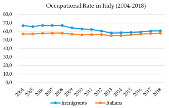 To date, the immigrant workforce having a regular resident card in Italy indicates an employment rate of 59% against a 9.7% unemployment rate, which parallels and even overcomes the local Italian workforce (Figure 1) [3]. Therefore, despite the fact that Italy is not a wealthy country, which is demonstrated by the difficulties for Italians in finding a job, several opportunities have been offered also to immigrants. In particular, specific ethnicities, such as the small populations coming from Nigeria, Bangladesh, and Senegal, have been recruited in occupational sectors where Italians nowadays represent a small minority. This is why it is important to highlight the similar chance in job opportunities between local and migrant workers (Figure 1).