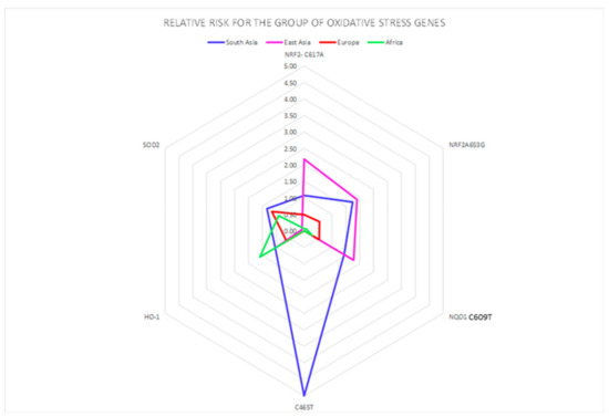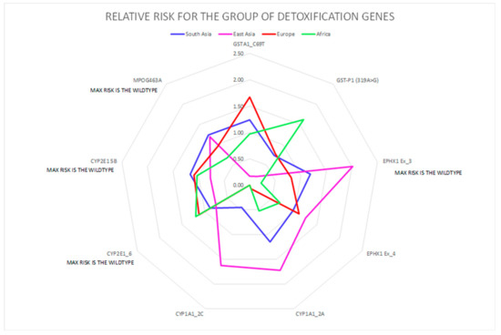 In Figure 2, the calculated RR for each ethnicity is visualized for the oxidative stress gene group, showing the highest susceptibility for specific genes. Similarly, the RR for each ethnicity is visualized for the detoxification gene group (Figure 3) and for the DNA repair gene group (Figure 4). The area subtended by each ethnicity curve of Figure 2 was calculated. The different areas obtained for each ethnicity were divided by the minimum area, representing the minimum risk for each of the considered groups of genes. The same procedure was repeated for Figure 3, Figure 4 and Figure 5.