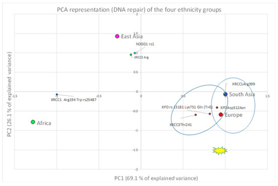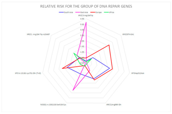 Lastly, a correlation between Europeans and South Asians in relation to four DNA repair genes was obtained. Both ethnic groups present a high risk for these genes in comparison to the other ethnicities (Figure 7).