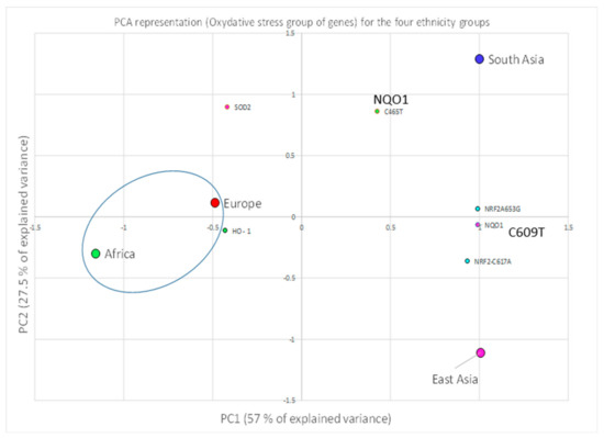 The PCA analysis allows us to visibly appreciate how effectively the four ethnicity groups are discriminated by the relative risk of the variant condition for the different genes of the group of genes under investigation. Africa and Europe are similar with respect to the oxidative stress genes, showing a low susceptibility risk.