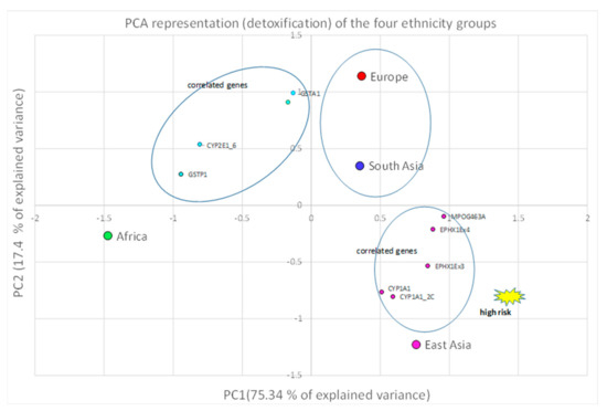 The PCA allowed us to appreciate the similarity found between ethnicities, for example in the African and European cluster (see the ellipse), which showed a high similarity and low RR for the oxidative stress genes (Figure 5). A low RR similarity between Europeans and South Asians in relation to the detoxification genes was found (Figure 6), whereas in the case of East Asians a good correlation of the ethnic group with five detoxification genes was detected, and was highlighted as high-risk (Figure 6).