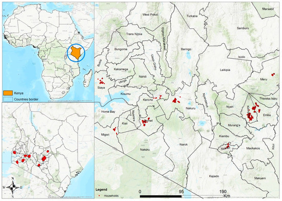 This was a cross-sectional study among participants who reported being diagnosed with hypertension and/or diabetes by a health practitioner. This study is part of a broader implementation research program between Familia Nawiri, a social venture program initiated in Kenya by Novartis, a multinational pharmaceutical company [26] and several County Ministries of Health in partnership with the Center for Research in Therapeutic Sciences at Strathmore University, Nairobi, Kenya, and the Swiss Tropical and Public Health Institute, Basel, Switzerland. The overall aim of the collaboration is to strengthen the Kenyan government’s community health strategy (CHS) through training of community health workers and health promotion at the household level in order to improve health outcomes. The study was conducted in selected community health units (CHUs) across nine counties in Kenya. CHUs form the lowest level of the healthcare system in Kenya; each CHU is designed to serve a catchment population of approximately 5000 people and is linked to a government health facility. Four CHUs in each of the nine counties were purposefully selected to take part in the study based on the fact that Familia Nawiri had on-going CHS engagements in those areas. The counties included: Bomet, Embu, Kericho, Kirinyaga, Meru, Migori, Nairobi, Nakuru and Siaya as shown in Figure 1. All CHUs are located in rural areas where agriculture was the main economic generating activity with the exemption of Nairobi where the CHUs were located in the slum areas of the city.