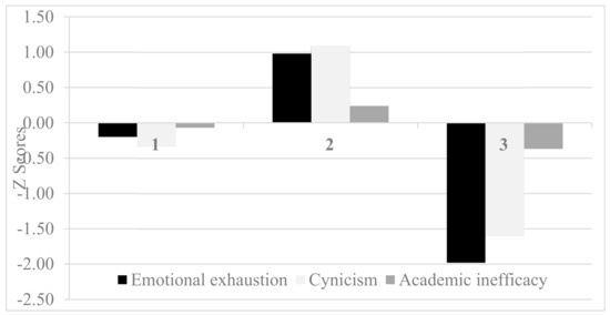 Academic burnout profiles based on standardized scores of each subscale. 1 = Profile 1 (moderately engaged group), 2 = Profile 2 (burnout group), 3 = Profile 3 (well-functioning group).