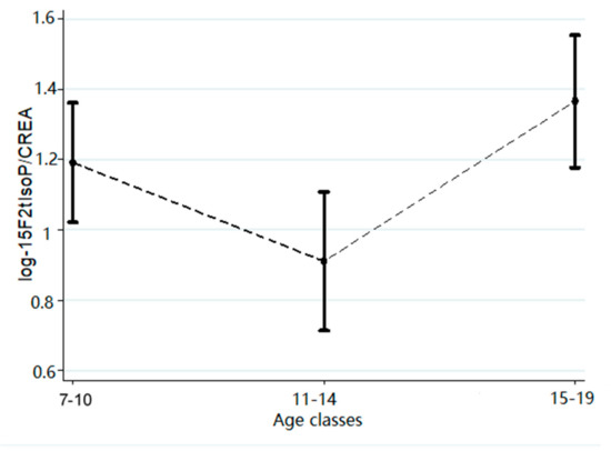 GlcA–BPA shows an increase of concentration proportional with increasing age, even if the intermediate age group (11–14 years) is slightly lower. The same thing is observed also for 15F2t-IsoP and the exposure to tobacco (mainly passively breathed) quantified by cotinine. According to the Box–Cox regression results, the values of the biological markers analyzed were subjected to a logarithmic transformation before carrying out the subsequent analysis. The result of piecewise linear robust regression shows a breakpoint at 1.79 (95% CI: 1.56–2.02; p < 0.001) of the effect of log-GlcA–BPA on log-15F2t-IsoP (Figure 1 and Table 3). Thus, the concentration of 15F2t-IsoP increases exponentially (more than threefold for each one-log unit of GlcA–BPA), when the log-GlcA–BPA concentration overcomes the breakpoint identified at 1.79 log-GlcA–BPA (6 ng/mg CREA). Multiple Linear Regression (MLR) analysis shows a positive effect also of log cotinine concentration on log 15F2t-IsoP (Table 3). This last effect is evident even considering that a 12% increase of 15F2t-IsoP is observed for each increment of a log-cotinine unit. Furthermore, the analysis of the relationship between log (ng 15F2t-IsoP/mg CREA) and age shows a V-shaped trend (Figure 2), with a significant decrease (p = 0.026) between infancy (7–10 years old) and the beginning of adolescence (11–15 years old), and then a new increase starting from 15 years of age (Figure 2 and Table 4).