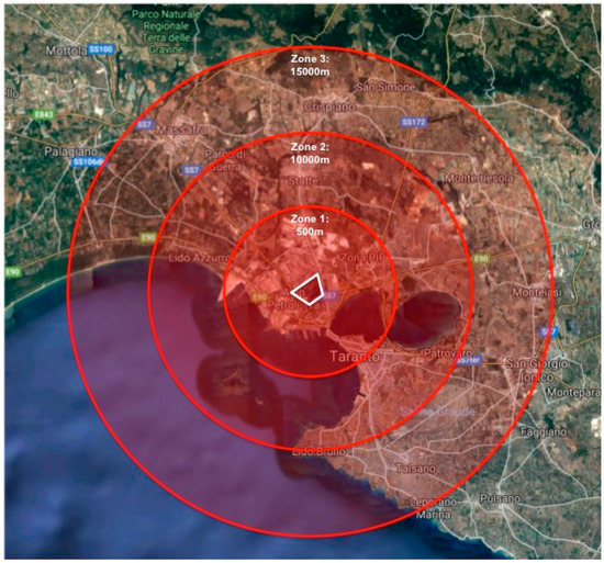 To categorize residential location, the Taranto municipality was divided geographically into three concentric residential zones (1, 2, 3) of increasing radial distance from the industrial complex. The industrial complex was defined as a polygonal region in which processes of steel preproduction (including iron ore extraction), production, and refinery were performed regularly (Figure 1).