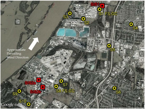 Primary measurement sites (S), labeled S1–S10, are shown in Figure 1 with detailed information provided in Supplementary Materials (SM), Table SM1. Additional information on major Rubbertown facilities is available elsewhere [21]. Passive samplers were deployed continuously at S1–S10 from 12 September 2017 (9/12/2017) to 9/12/2018. Each PS deployment cycle was nominally 14 days in duration, yielding 26 total sampling periods. One PS site, S11 (not shown in Figure 1), was added to the north of the primary project area from 6/19/2018 to 9/12/2018 (6 PS periods). All PSs were located close to a facility fenceline (<0.5 km), except S4, S6, and S11 that were deployed at neighborhood schools >1 km from the nearest Rubbertown facility. Prototype FSs and field GCs were deployed at S1 and S8 for part of the first year. S1 is the location of the permanent LMAPCD Firearms Training Center (FTC) monitoring site and contained the LMAPCD auto-GC, a field GC (MiTAP), and FSs (Figure 2). Time-resolved FSs began operation at S1 on 9/13/2017 and at S8 on 6/4/2018 with a field GC moved from S1 to S8 and made operational on 7/25/2018. A limited number of manually activated and automated canister grab samples, (MCGS and ACGS respectively), were acquired in the first year of the project with the ACGS executed only at S1 and S8, using acquisition triggers provided by FSs and a field GC. Wind roses from local LMAPCD monitoring sites are contained in Supplementary Figure SM1, with the approximate dominant wind direction indicated in Figure 1.