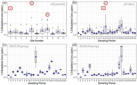 PS-determined 1,3-butadiene concentrations: (a) By monitoring site with all 26 PS sampling periods grouped [6 periods for S11], (b) by PS sampling period with all 10 monitoring sites grouped, (c) by period with three sites closest to 1-3 butadiene-relevant facilities grouped (near-facility group), and (d) by period with two farthest sites and an upwind site grouped (community/upwind group). The box whiskers extend to the largest measurement <1.5 times the interquartile range. Blue markers indicate means with 95% confidence intervals calculated by non-parametric bootstrap. The red box and circles in (a) and (b) indicate the highest reading at S1 during period 12 and highest readings at S5 and S8 during period 13, respectively.