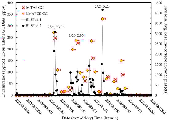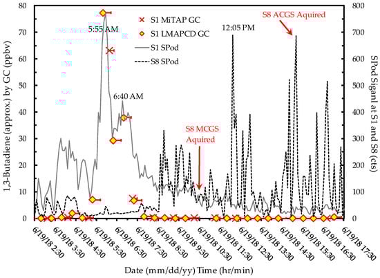 Time-resolved observations of SIS2 with SPod readings (five-minute average) plotted on the secondary ordinate axis. Single side horizontal error bars in GC data indicate the temporal extent of air sampling. The SPod data are non-speciated, and do not directly correspond to 1,3-butadiene.