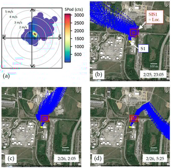 (a) S1 SPod source direction indicator (SDI) plot for 22:00 on 2/25/2018 to 11:00 on 2/26/2018 with concentric circles representing wind speed in m/s and color bar SPod PID, and (b), (c), and (d) showing 99 back trajectory paths each for the five-minute BTM runs for 23:05 on 2/25/2018, 2:05 on 2/26/2018, and 5:25 on 2/26/2018, respectively, the highest concentrations of Figure 4. The concentric red boxes represent the near-optimal trial source location from TCTA with the inner box approximating the defined source areas for the TCTA calculation.