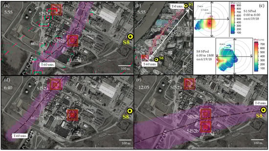 From a closer vantage point at S8, the SPod SDI plot (Figure 7c, bottom panel) significantly departed from the SIS2a position and indicated that a source south of SIS2a was the major contributor to the non-speciated SPod signal. Figure 7e shows a higher uncertainty S8 BTM corresponding to the 12:05 elevated SPod reading (Figure 6) with a mean trajectory passing just south of the initially-selected SIS2b location. With complementary uses of NGEM tools, some optimization of the position of SIS2b along the direction of plume propagation can be attempted and is represented here as SIS2b’, 100 m south of SIS2b, Figure 7e.