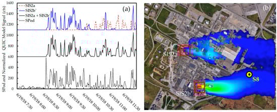 (a) Comparison of one-minute time average SPod readings from S8 (bottom panel) with QUIC model simulated emission time series from SIS2a (red dashed trace top panel), SIS2b’ (blue trace top panel), and a composite result of SIS2a and SIS2b’ (middle panel), (b) frame of QUIC model video (Video SM5) at 10:15 on 6/19/2018.