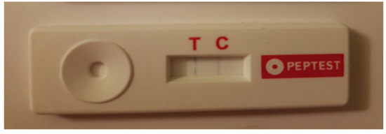 Each sample was centrifuged at 400 rpm for 5 min at normal room temperature. Subsequently, 80 µL of supernatant was collected and added to 240 µL of migration buffer. The mixture was then vortexed for 10 s: 80 µL of this mixture was pipetted into the well of the Pep-testTM Lateral Flow Device (LFD) and the results were ready after 15 min.