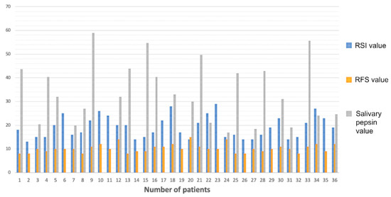 Figure 3. Histogram: Patients positive in reflux symptom index (RSI) (blue column), reflux finding score RFS (yellow column), and PEP-test (gray column) evaluations. Patients with only RSI and RFS columns were those that showed positivity to clinical investigation but negativity for salivary pepsin presence (negative PEP-test).
