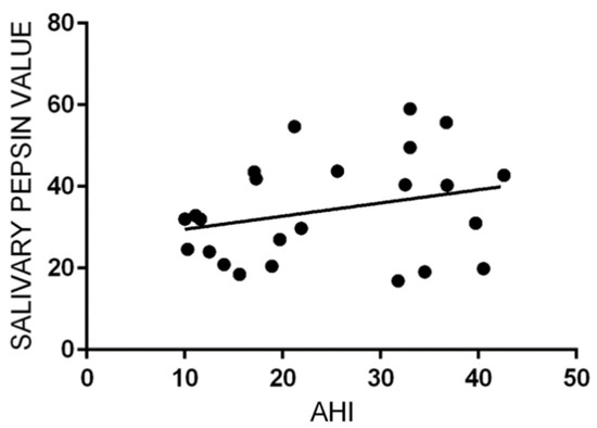 Figure 4. Liner regression scatterplot between apnea–hypopnea index (AHI) and salivary pepsin concentration. No statistical correlation resulted (p = 0.19, R2 = 0.07).