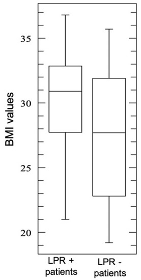 Figure 5. Box plot: Correlation between BMI (body max index) values of LPR (laryngopharyngeal reflux) + and LPR− patients.