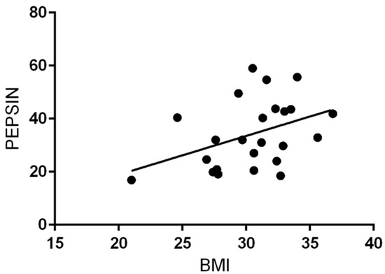 Mean BMI was higher in patients with salivary pepsin positivity than in PEP-test negative patients, with a statistical difference (p = 0.02; Table 1) (Figure 5). Moreover, a direct correlation between BMI and the value of pepsin in salivary specimens was submitted to regression analysis (p = 0.05 R2 = 0.2; Figure 6).