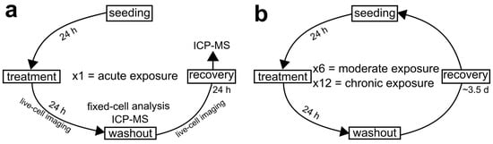 Diagrammatic representation of the experimental design conceived for the present study. (a) Experimental scheme for acute AgNP exposure where cells undergo one, 24 h AgNP treatment. (b) Experimental scheme for moderate and chronic AgNP exposure. For these prolonged exposures, acutely treated cell populations were maintained in culture and repeatedly exposed to AgNPs. After recovery, cells were passaged and exposed to another AgNP treatment. This cycle was repeated either six times (moderate exposure) over a period of three weeks or twelve times (chronic exposure) over a period of six weeks. In all experiments, live-cell imaging was performed in cells undergoing the last treatment cycle and during the 24 h following washout. Moreover, fixed-cell analysis was performed at the end of the last treatment cycle.