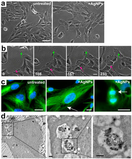 Silver nanoparticle internalization. (a) Still images from untreated (left) and AgNP-treated (right) live cell samples showing the presence of refractive dots (AgNPs) on and around the cells in the treated (right), but not in the untreated (left) sample (see also additional file 2). Scale bar, 10 μm. (b) Still images from time-lapse microscopy showing AgNPs becoming engulfed by individual cells. The green and pink arrows point at particles that are extracellular in the initial frame, but become engulfed by individual cells at subsequent time points and persist as intracellular particles (see also additional file 3). Numbers indicate elapsed time in min; Scale bar, 10 μm. (c) Representative images of fixed cells fluorescently stained for microtubules (green) and DNA (blue). The left image shows untreated cells. The middle and right images show an interphase and a mitotic cell, respectively, treated with 50 µg/mL of AgNPs. Arrows point to dark fluorescence-exclusion regions, assumed to be pockets of intracellular AgNPs. Scale bars, 10 μm. (d) Progressively magnified images from a transmission electron micrograph showing an example of a cell with internalized AgNPs contained in intracellular vesicles. Scale bars, 2 µm (left panel), 500 nm (middle and right panels).