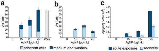 Silver nanoparticle intracellular accumulation. (a) Concentration of silver (ppb) found in adherent cells (light blue portion of bars) or in the extracellular medium (dark blue portion of bars) following acute exposure to AgNPs. The far-right grey bar shows the concentration of silver in a stock suspension of AgNPs prepared at a concentration of 75 µg/mL. (b) Concentration of silver (ppb) found in adherent cells (light blue portion of bars) or in the extracellular medium (dark blue portion of bars) following a 24 h recovery period from acute exposure. (c) Silver concentration normalized to the number of adherent cells in each sample.