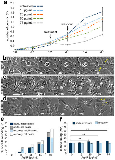 Effects on cell division and cell proliferation from acute AgNP exposure and recovery. (a) Growth curves for cells treated with increasing concentrations of AgNPs. (b–d) Still frame images from time-lapse microscopy showing: (b) a cell undergoing normal mitosis (yellow arrows pointing at the two resulting daughter cells), (c) cells rounding up and remaining rounded for more than 3 h (considered arrested), and (d) a cell rounding up and subsequently displaying signs of cell death (yellow arrows). Numbers indicate the elapsed time in min; Scale bars, 10 μm. (e) Percent of cells observed to either arrest or die after rounding up. The data corresponding to events observed during treatment are shown in darker colors (dark blue and grey) whereas the data corresponding to events observed during recovery are shown in lighter colors (light blue and white). (f) Mitotic timing in cells completing mitosis during an acute AgNP treatment (dark blue bars) or recovering from an acute AgNP treatment (light blue bars). ** t-test, p < 0.005