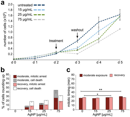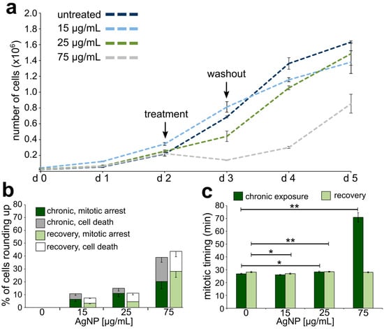 Growth curves, analysis of mitotic behavior, and mitotic timing were also obtained for moderately exposed cells undergoing or following a sixth AgNP treatment. Similar to what we observed for acute exposure, cells moderately exposed to 75 μg/mL of AgNPs experienced a negative proliferation rate during treatment (Figure 5a). However, in moderately exposed cells, even lower concentrations of AgNPs (15 and 25 μg/mL) induced a decrease in the proliferation rate during treatment (Figure 5a), which was not the case for acutely exposed cells at these lower concentrations (see Figure 4a). At all doses, proliferation resumed after AgNP washout (Figure 5a). These moderately exposed cells also displayed mitotic arrest or death in a dose-dependent manner during treatment (Figure 5b). However, the cells appeared to recover more quickly compared to acutely treated cells (compare Figure 5b and Figure 4e), possibly suggesting some form of “adaptation” to the adverse effects of AgNPs. For moderate exposure, a statistically significant increase in mitotic timing was observed only in cells treated with 75 μg/mL of AgNPs (Figure 5c), for which mitotic timing was 30.60 ± 0.71 min (mean ± SEM) compared to 25.40 ± 0.53 min in control cells (Figure 5c). Cells regained normal mitotic timing during recovery from AgNP exposure, although a slight elevation was observed in cells recovering from a 25 μg/mL AgNP moderate treatment (Figure 5c). In summary, these results indicate that moderate exposure to AgNPs impacts the dynamics of cell proliferation (Figure 5a). A general resumption of proliferation capacity is observed during recovery, although observations at the single-cell level indicate that mitotic arrest and cell death continue to occur even after AgNP washout (Figure 5b), but at lower rates than we observed for acutely treated cells.