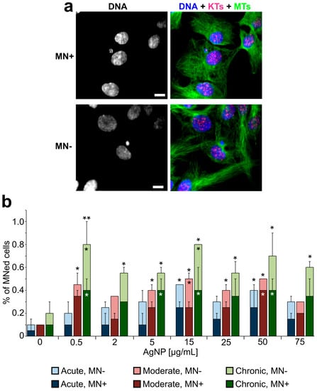 In parallel to the analysis of proliferation, mitotic behavior, and timing, we prepared fixed samples from cells treated with a larger range of AgNP doses and performed an analysis aimed at identifying nuclear phenotypes that may emerge from defective cell division [56]. Specifically, we quantified the frequency of micronuclei (Figure 7a), which may result from mitotic errors occurring at the single chromosome level, and the frequency of abnormal nuclei (Figure 8a,b) that may arise from large-scale cell division defects, such as mitotic slippage (mitotic exit without chromosome segregation) or cytokinesis/abscission failure. Micronucleus analysis (Figure 7b) showed that micronuclei are very rare in untreated cells. However, the fraction of micronucleated cells was significantly higher in many of the treated samples (Figure 7b). For acutely treated cells, an increase in micronucleated cells was observed, but, in most cases, the increase was not statistically significant compared to the untreated cells. However, in cells exposed to moderate and chronic treatments, the number of micronucleated cells was substantially increased even at low doses. Indeed, in chronically exposed cells, even a dose as low as 0.5 μg/mL induced a 4.5-fold increase in the number of cells with micronuclei. Surprisingly, we did not observe a dose-dependent relation (i.e., no statistically significant differences were observed between doses within individual treatment regimens). To discriminate between micronuclei originating from chromosome missegregation and micronuclei originating from DNA damage [60], we immunostained for kinetochore proteins and quantified kinetochore-positive (MN+, Figure 7a, top) vs. kinetochore-negative (MN-, Figure 7a, bottom) micronuclei. This analysis showed that the fraction of cells with kinetochore-positive micronuclei (Figure 7b, dark bars) was generally greater than the fraction of cells with kinetochore-negative micronuclei (Figure 7b, light bars), indicating that micronucleus formation due to missegregation of whole chromosomes was a more common event than micronucleus formation due to the presence of chromosome fragments.