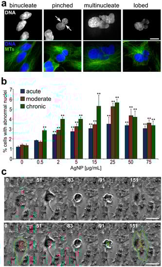 To identify the possible occurrence of large-scale cell division defects, we analyzed interphase nuclei and identified abnormal phenotypes. The common abnormal nuclear phenotypes that we observed included binucleate, multinucleate, pinched, and lobed nuclei (Figure 8a). In many cases, the total amount of DNA in these cells with abnormally shaped nuclei appeared to be larger than (about twice) the amount of DNA in cells with single, normally shaped nuclei. The percentage of cells with abnormally shaped nuclei was significantly higher (up to ~five-fold) in AgNP-treated cells compared to the controls (Figure 8b). Similar to what we found for micronuclei, even at very low AgNP concentrations but longer exposure times, a substantial increase in the number of cells with these abnormal nuclear phenotypes could be observed (Figure 8b, green bars). Noticeably, we were able to gather evidence that some of these cells with abnormal nuclei could re-enter mitosis (Figure 8c and Video S3), indicating that exposure to AgNPs, even at very low doses, could have long-lasting effects on the cell population if exposure occurs for a prolonged period of time.