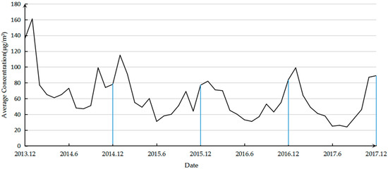 The variation of PM2.5 concentration from December 2013 to December 2017 is shown in Figure 2. It can be seen that the annual PM2.5 changes are characterized by a U-shaped curve, that is, the highest concentration is observed in January, followed by a downward trend, and the concentration in July and August is low, and then increases. The U-curve characteristic is most significant in 2017, with a minimum concentration of 24 μg/m3 in August 2017 and a maximum concentration of 99 μg/m3 in January. In 2014, the lowest concentration of 47 μg/m3 appeared in August, and the highest concentration in January was 136 μg/m3, with small peaks in June and October. In 2015, the lowest concentration in June was 31 μg/m3, the highest concentration in January was 115 μg/m3, and local high values appeared in May and October. In 2016, the lowest concentration of 33 μg/m3 appeared in June and the highest concentration in December was 84 μg/m3. The local high value appeared in September. In addition, it can be seen intuitively from Figure 1 that the PM2.5 concentration is decreasing year by year and the concentrations in January and December 2017 are higher than the corresponding months in 2016.