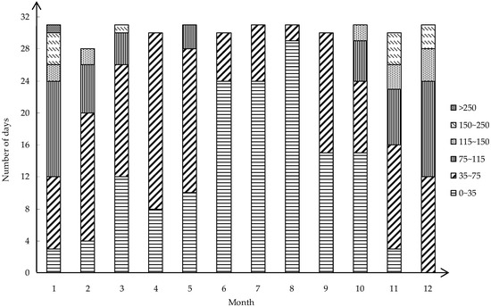 Figure 4. The number of days in each concentration interval of PM2.5 in each month of 2017.
