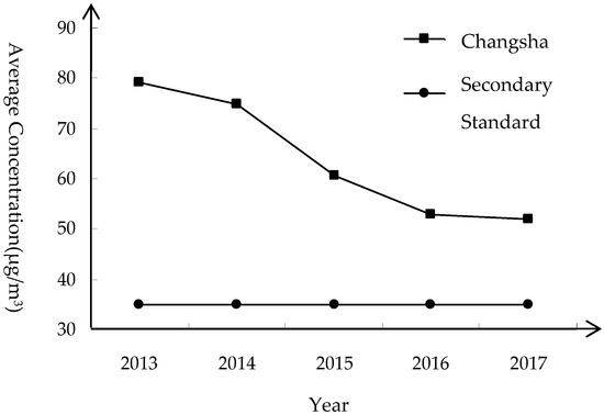 In 2013, the annual average concentration of PM2.5 in Changsha City reached 79.1 μg/m3. Although the government adopted a series of policies to control the concentration of PM2.5, the average annual concentration of PM2.5 in Changsha still reached 52 μg/m3 in 2017. According to the secondary standard of 35 μg/m3 in China’s Ambient air quality standard (GB 3095-2012) and the threshold concentration of 10 μg/m3 delineated by the World Health Organization (WHO) [1,6], the problem of PM2.5 pollution in Changsha still remains severe.