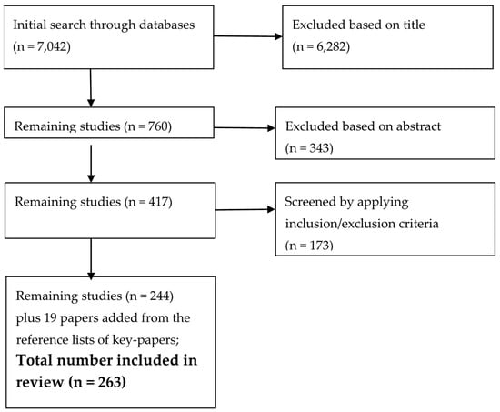 All papers were pooled and duplicates removed, resulting in a total of 7042 papers. The literature was initially screened by two members of the research team (CWN, JC), using a comparative and consensus orientated method (Figure 1). After exclusion based on the title and abstract, there were 417 papers for review. When applying the inclusion/exclusion criteria, another 173 papers were excluded. An additional 19 papers were included from the reference lists from key-papers, taking the total papers for review to 263.