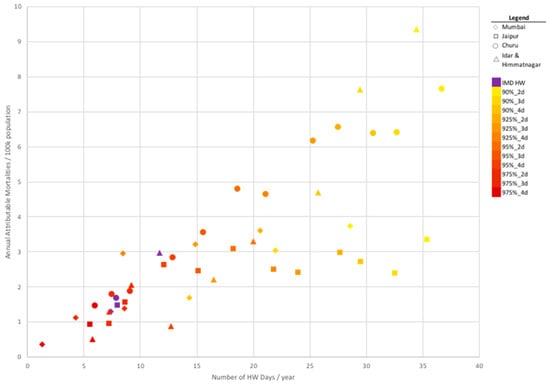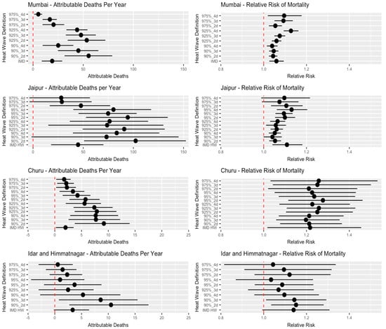 Figure 1 shows the historical attributable deaths per year and relative risk of mortality associated with different heat wave definition criteria. Relative risk of mortality ranged from 1.28 [95% CI: 1.11–1.46] in Churu under the 95%_2d heat wave definition to 1.03 [95% CI: 0.87–1.23] in Idar and Himmatnagar under the 95%_4d definition. There is a wide spread in both the relative risk of heat waves and the attributable deaths associated with heat waves, indicating that both are largely dependent on the criteria used for declaring a heat wave. Further, Figure 1 shows the importance of going beyond the use of RR and examining the possibility of using health events to represent the impact of heat waves; the number of heat wave attributable deaths is an important driver of the variability of the HW-related burden in addition to relative risk. Some heat wave definitions were associated with a high relative risk; however, the absolute health burden is diminished because few days on record match those criteria.
