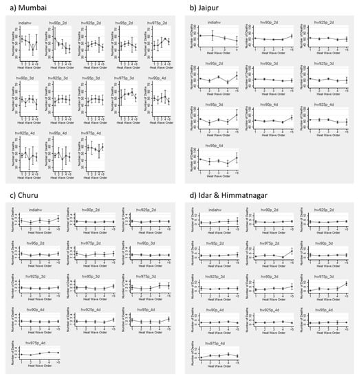 Number of deaths per each heat wave definition, by timing in season for all HW definitions (where distinct HW periods occur; definitions with identical outcomes removed) by community—(a) Mumbai, (b) Jaipur, (c) Churu, & (d) Idar & Himmatnagar