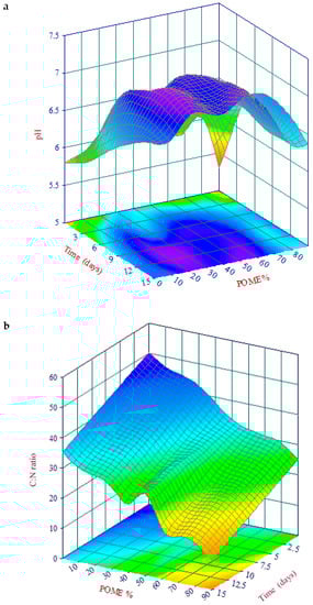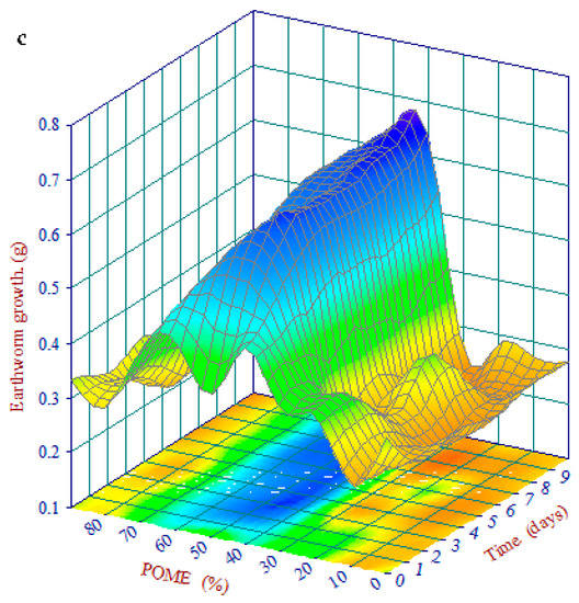 Equation (2) describes the behavior of C:N ratio at different time and mixture of POME. The C:N ratio of the vermicompost reflected the mineralization and stabilization of the substrate. The earthworms assist in addition of nitrogen in the form of mucus and nitrogenous excretory material and decreased carbon content through releasing of carbon dioxide [32]. The process of vermicomposting causes reduction in C:N ratio in the mixture. The three-dimensional response surface plot is used to show pH as a function of time and POME percentage is shown in Figure 2a. The C:N ratio affected the earthworm growth directly, as reported by Rupani et al. [33] that high C:N ratio positively increased the earthworm biomass. Equation (3) explains the behavior of earthworm biomass at different times, shown in Figure 2c.