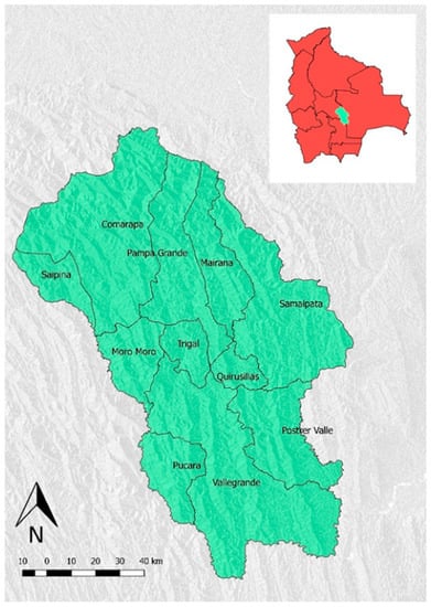 The “Valles Cruceños” region is located in Southern Bolivia, within the Department of Santa Cruz de la Sierra, bordering the Departments of Cochabamba and Chuquisaca. The region consists of three provinces (Florida, Manuel Maria Caballero and Vallegrande) including eleven municipalities: Comarapa, Mairana, Moro Moro, Pampa Grande, Postervalle, Pucarà, Quirisillas, Saipina, Samaipata, Trigal and Vallegrande (Figure 1). It is one of the poorest and least developed areas of the Department. In this context, the main land uses are agriculture and rangelands [24].
