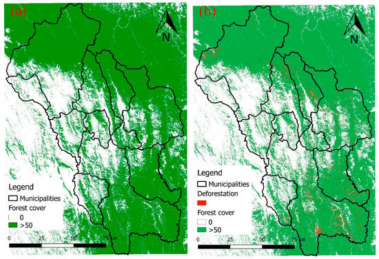 Forest cover changes in the last two decades [31]. (a) Forest cover at the year 2000. (b) Forest loss between the years 2000–2017. Maps were created considering only pixels with a value of forest >50% as “forested”.