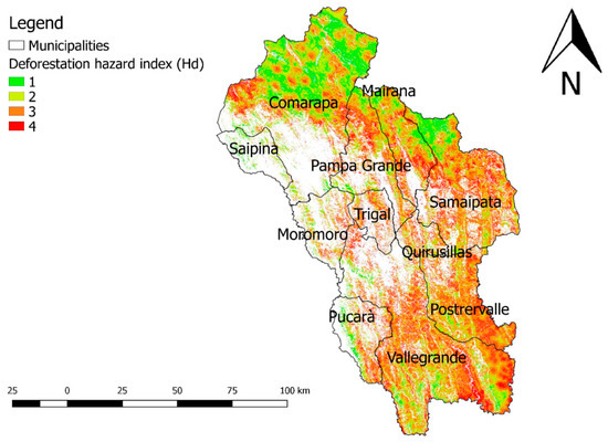 In order to generate a deforestation hazard indicator (Hd) map, data were processed through QGIS (QGIS.ORG, Zurich, Switzerland) and GRASS GIS (Open Source Geospatial Foundation, Beaverton, OR, USA) software. The analysis has been based on the Global Forest Change (GFC) database, published in 2013 by Hansen et al. [31]. GFC is updated yearly and provides raster maps of tree cover percentage of the year 2000, tree cover loss and gain for each successive year, with a spatial resolution of 30 m, based on Landsat data. Cover loss and gain are binary datasets, with pixel value of one if deforestation/afforestation has occurred, and 0 if not.