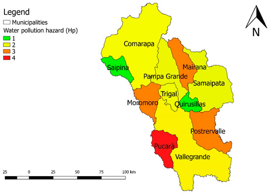 In order to have a spatialized information on the water pollution hazard throughout the territory of the “Valles Cruceños”, a specific water pollution hazard (Hw) indicator was defined by using the information about the farming and breeding activities, provided by the agro–economic census [32], reporting the most updated data at the time of the analysis. This allowed the identification of the percentage of agricultural or grazing surfaces (A) of each municipality. These latter were calculated as the ratio between the sum of agricultural and grazing areas, and the total area of each municipality. To the municipalities with the most extensive surfaces was given a hazard index of 4, to those with slightly inferior surfaces 3 and so on up to 1 (Table 6).