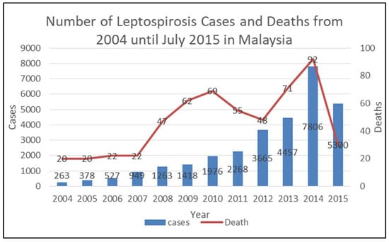 Figure 1. Summary of the number of leptospirosis cases and associated deaths in Malaysia from 2004 to July 2015 [26].