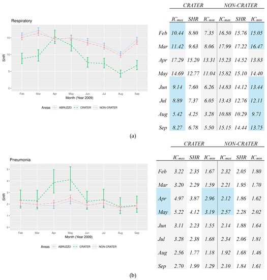 - The short-term period after the quake showed a visible increase of Crater admissions for respiratory diseases within all subgroups. Monthly SHRs resulted significantly higher in the Crater than the non-Crater area for pneumonia both in April and May, and for respiratory insufficiency only in April;