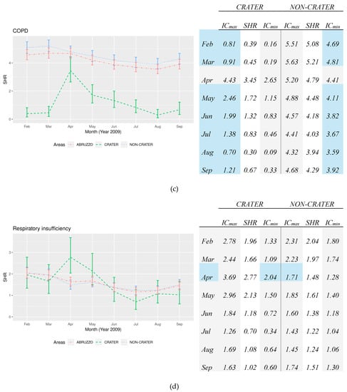 SHRs for COPD are significantly lower in the Crater than the non-Crater area along the short-term period analysis, except for the evident peak detected in April: (3.45 starting from 0.45 in the Crater respect to 4.79 starting from 5.21 in non-Crater) in which SHRs confidence intervals overlapped and for this the difference is not significant, as shown in Figure 1c. Moreover, the trend detected in the non-Crater was exactly the opposite respect to the one found in the Crater, a progressive decrease from March to August. Hospitalizations rates for respiratory insufficiency were constantly higher in the non-Crater area vs. the Crater area even if the difference was not significant, except in April and May. SHRs resulted significantly higher in the Crater area respect to the non-Crater area in April: 2.77 vs. 1.48. This trend persisted also in May (Crater 2.13 vs. non-Crater 1.61), although the difference reported was not significant, as shown in Figure 1d.