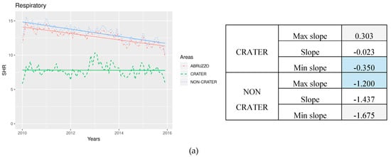 The background of the standardized hospitalizations rates for all causes of hospital admissions shows an overall decrease in the Abruzzo Region, with significant differences among the local areas. In terms of medium-long term analysis, the trend decrease for all causes of hospitalization appears less evident in the Crater area respect to the non-Crater area. The slope decrease showed a significant difference between Crater (−0.011/month) and non-Crater (−0.024/month), as shown in Table 2.