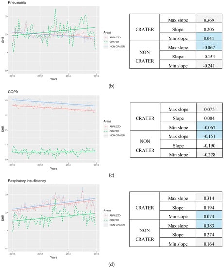 - The crater area showed a significantly less marked decrease with respect to the non-Crater area for all kind of hospitalizations, for respiratory diseases, COPD, and pneumonia. Overall, the slope decrease in the Crater area was always lower than the non-Crater area, even opposite in the case of pneumonia and COPD.