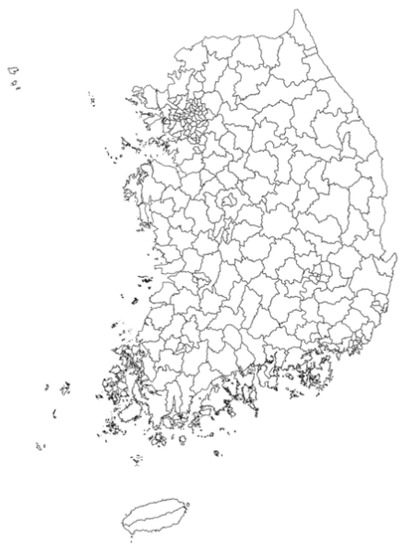 This study was conducted over the entire area of South Korea and accounted for the period from 2012 to 2015. There are 250 administrative districts in South Korea (Figure 1) and, because some administrative districts changed during the study period, we conducted analyses based on the administrative areas as of 2012. We used the data from 2012–2014 for model fitting, and data from 2015 for forecasting and evaluation.